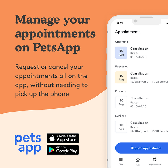 Consultatons, Vaccinations and Health Plan appointments at one of our veterinary clinics can now be booked online 24/7 using PetsApp. Just download the app to your mobile phone, sign up, and select an appointment time to suit your needs. PetsApp can be accessed via desktop and laptop computers too.